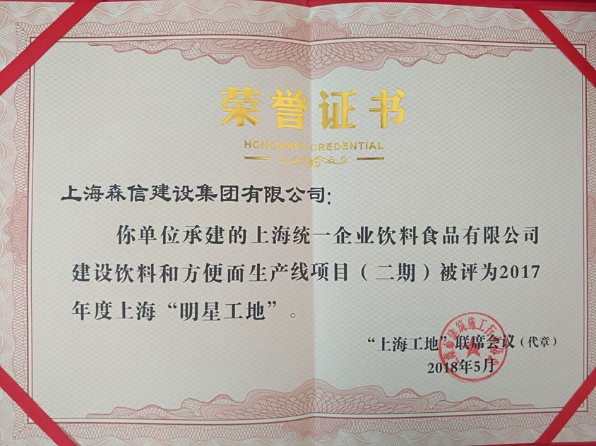 本次共評選出108個項目為2017年度上海“明星工地”,上海森信承建的“上海統(tǒng)一企業(yè)飲料食品有限公司建設飲料和方便面生產(chǎn)線項目(二期)”獲上海市“明星工地”殊榮,三分公司經(jīng)理于宏明代表公司上臺領獎。