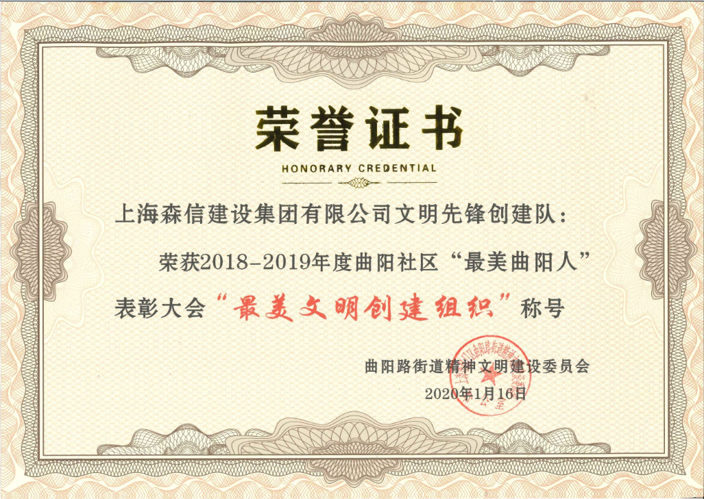2020年1月16日下午,2018—2019年度曲陽社區(qū)“最美曲陽人”表彰大會(huì)暨迎新春聯(lián)歡會(huì)在 上海外國語大學(xué)逸夫會(huì)堂舉行,我司申報(bào)的“文明先鋒創(chuàng)建隊(duì)”榮獲 曲陽社區(qū)“最美文明創(chuàng)建組織”稱號(hào)。