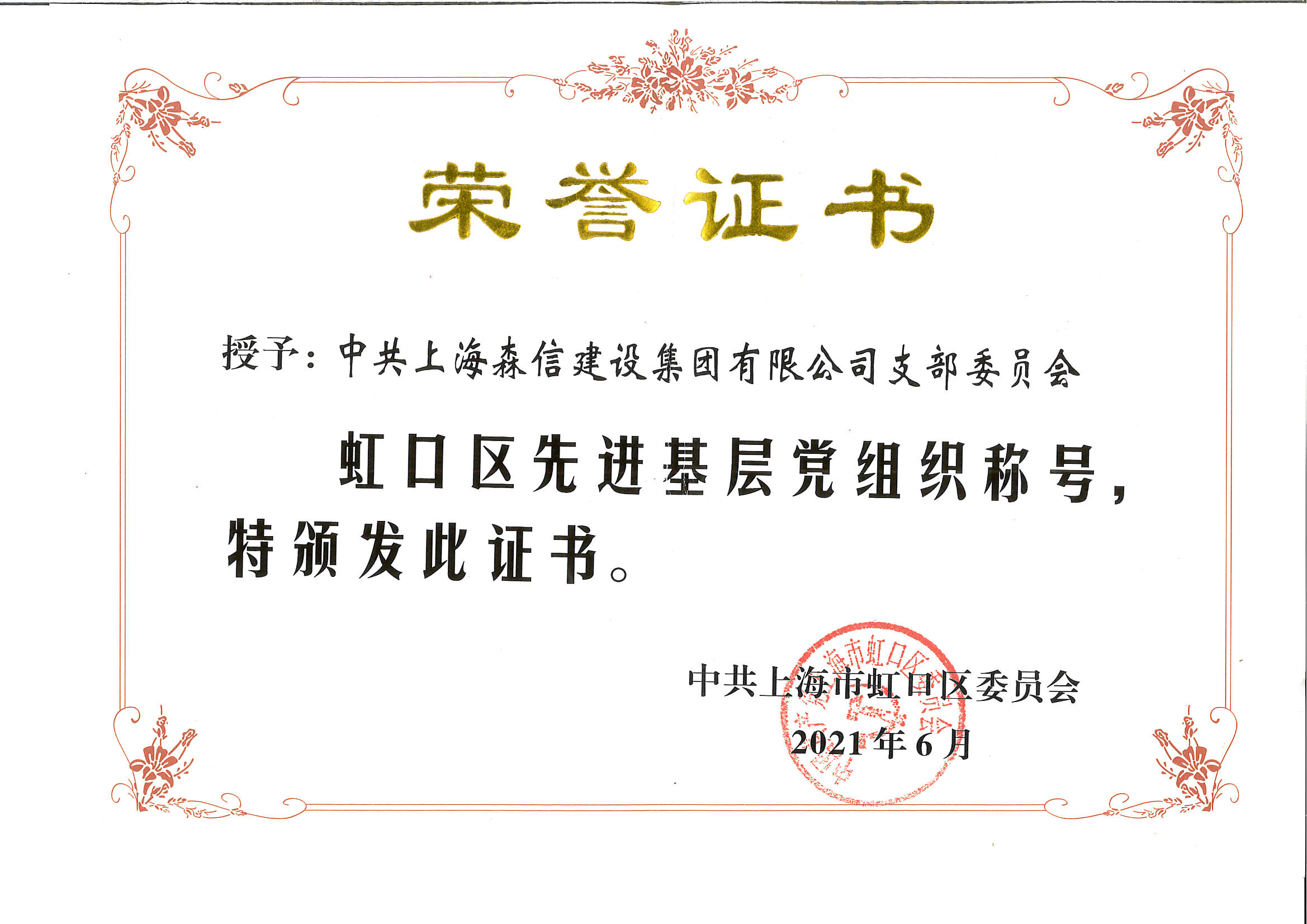 近日,中共上海森信建設(shè)集團(tuán)公司支部委員會(huì)獲評(píng)“虹口區(qū)先進(jìn)基層黨組織”。在建黨一百周年之際,這份榮譽(yù)是對(duì)我司黨建工作至高褒獎(jiǎng),是對(duì)工作不足的鞭策,更為我支部后續(xù)黨建群團(tuán)工作順利開(kāi)展注入了不竭動(dòng)力。