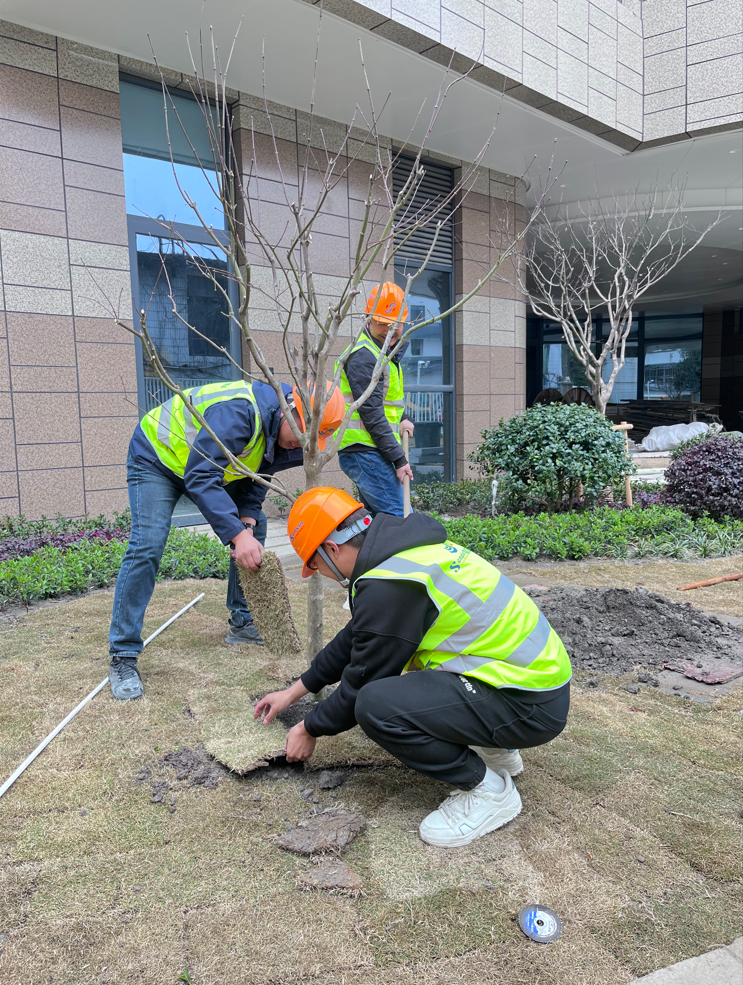 中福會幼兒園項目活動現(xiàn)場,大家熱情高漲、干勁十足,一片繁忙的景象。刨坑、移樹、扶樹、填土、澆水,各個環(huán)節(jié)銜接有序,一棵棵象征著生機和希望的樹苗被植入土中,在明媚的春光中展現(xiàn)出勃勃生機。